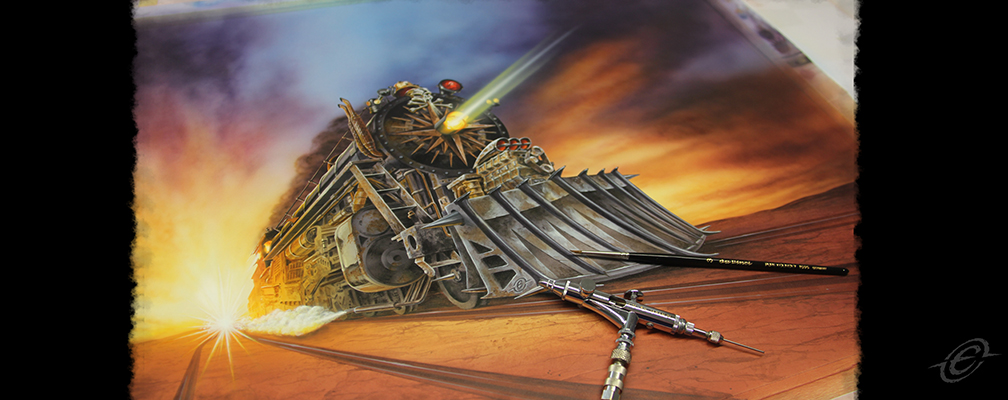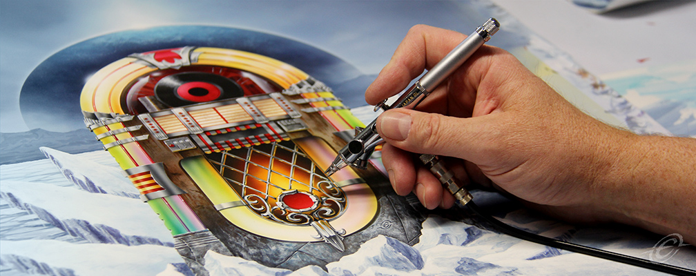 Je suis spécialisé en aérographie, créations graphiques et illustrations, le plus souvent pour le milieu musical et également pour des couvertures de livres, posters, brochures de prestige, T-shirts et packaging.